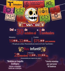 Ciudad Victoria, Tamaulipas.- La Comisión de Parques y Biodiversidad de Tamaulipas, invita a las familias a vivir la magia del Día de Muertos con el espectacular “Buu en el Zoo”, que tras el éxito de ediciones pasadas, regresa con mayor emoción en cuatro fechas, para llenarte de sorpresas y tradiciones en un ambiente único.