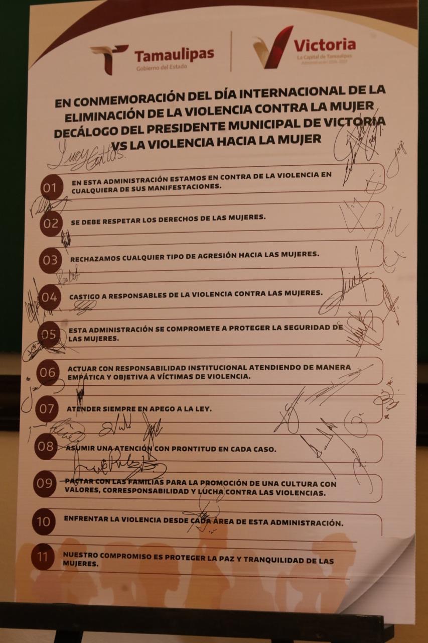 Ciudad Victoria, Tamaulipas.- Con la presencia de la presidenta del Sistema DIF, Lucy de Gattás, el alcalde de Victoria Eduardo Gattás Báez firmó, junto a integrantes del Gabinete Municipal, el decálogo contra la violencia hacia la mujer para dar paso firme hacia un futuro libre de violencia de género.