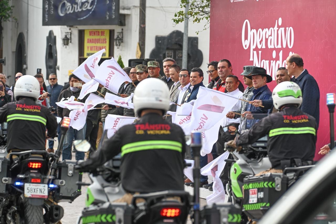 Ciudad Victoria, Tamaulipas.- Con 350 elementos policíacos, de protección y auxilio, el alcalde de Victoria Eduardo Gattás Báez dio el banderazo al operativo navideño 2025, para reforzar la seguridad de residentes y visitantes a la Capital durante la época decembrina.